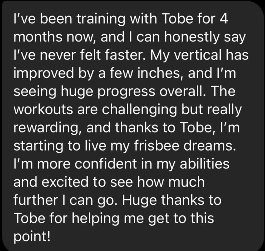 I believe that everyone deserves to train in a way that helps them reach their full potential, whether in sports or daily life. With specialized training plans, I help athletes and individuals level up faster, prevent injuries, and build a strong, healthy body. For ultimate players, that means becoming faster, stronger, and more agile on the field, improving endurance, and staying injury-free to perform at their best every game. Whether you want to dominate on the field or simply feel great in your body, I’m here to help you get there.